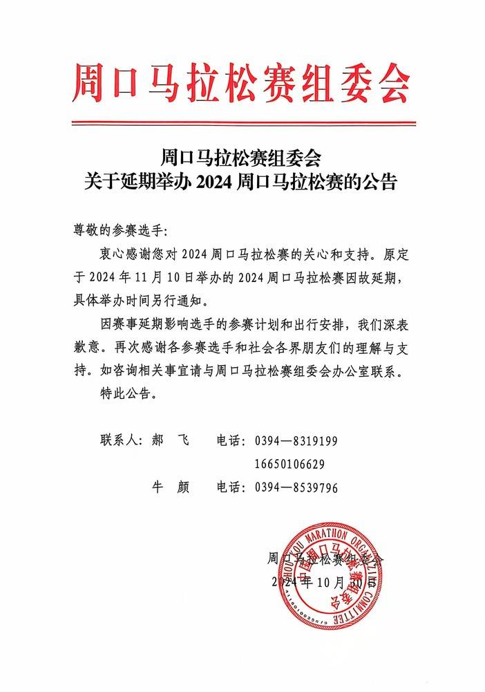 周口马拉松赛组委会 关于延期举办2024周口马拉松赛的公告